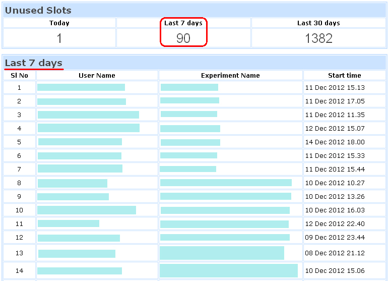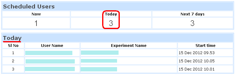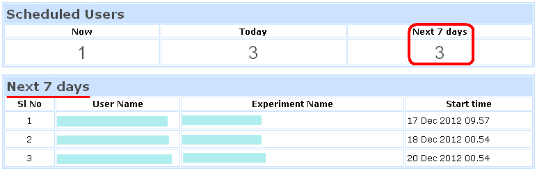 This table contains the details of reserved remote trigger users of the next 7 days with their user name, experiment name and experiment start time. This table can be displayed by clicking on the Next 7 days count. Table screen shot is given below.