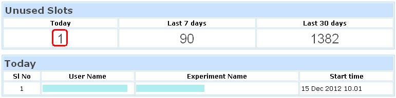 On clicking the count mentioned under, “Now”, a table is displayed that lists the entire remote trigger users of the current time with their user name, experiment name and experiment start time. Table screen shot is given below.